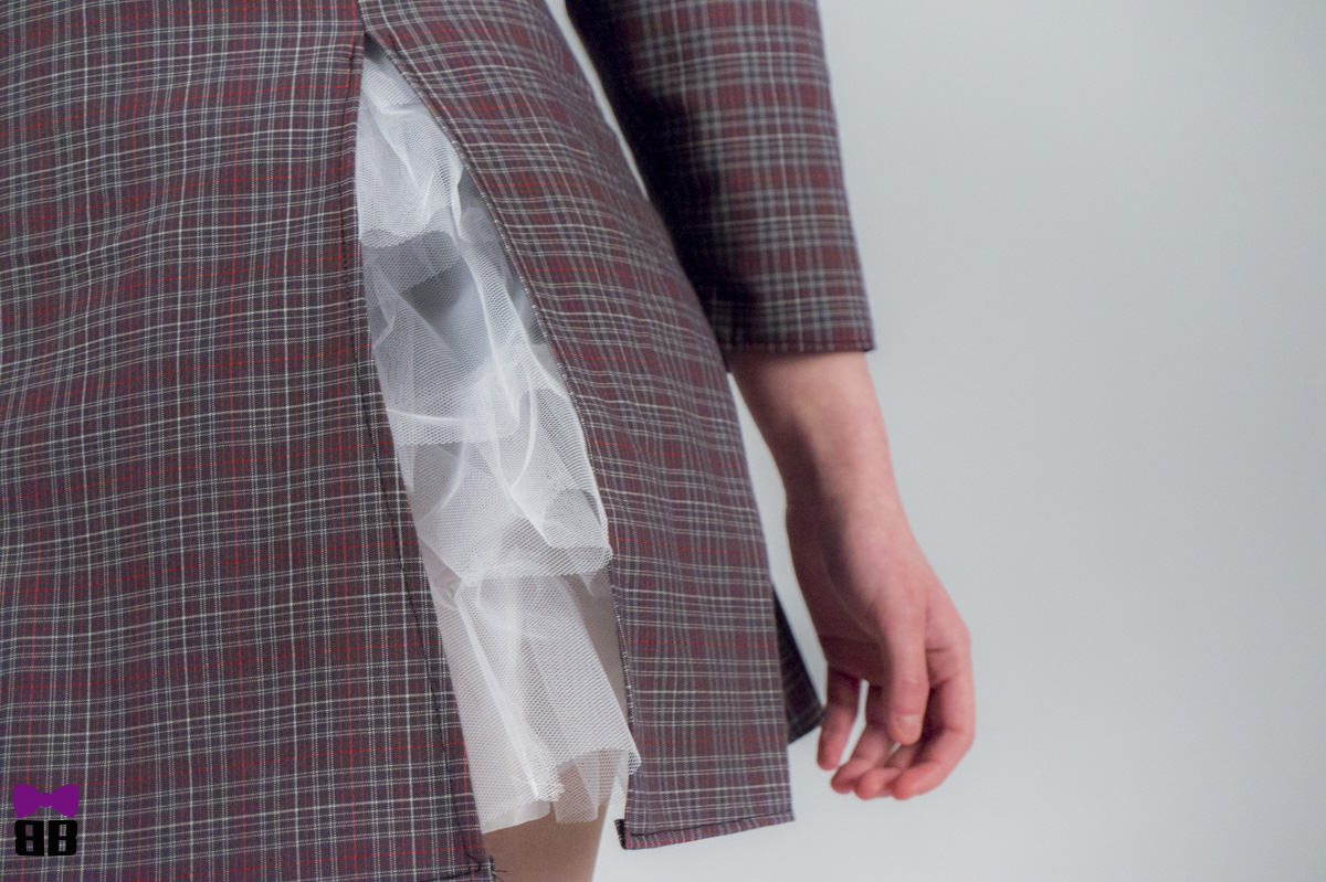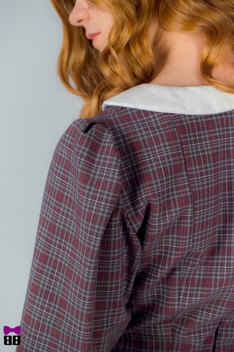 A beautifully shaped dress made in tartan gray and red motives.