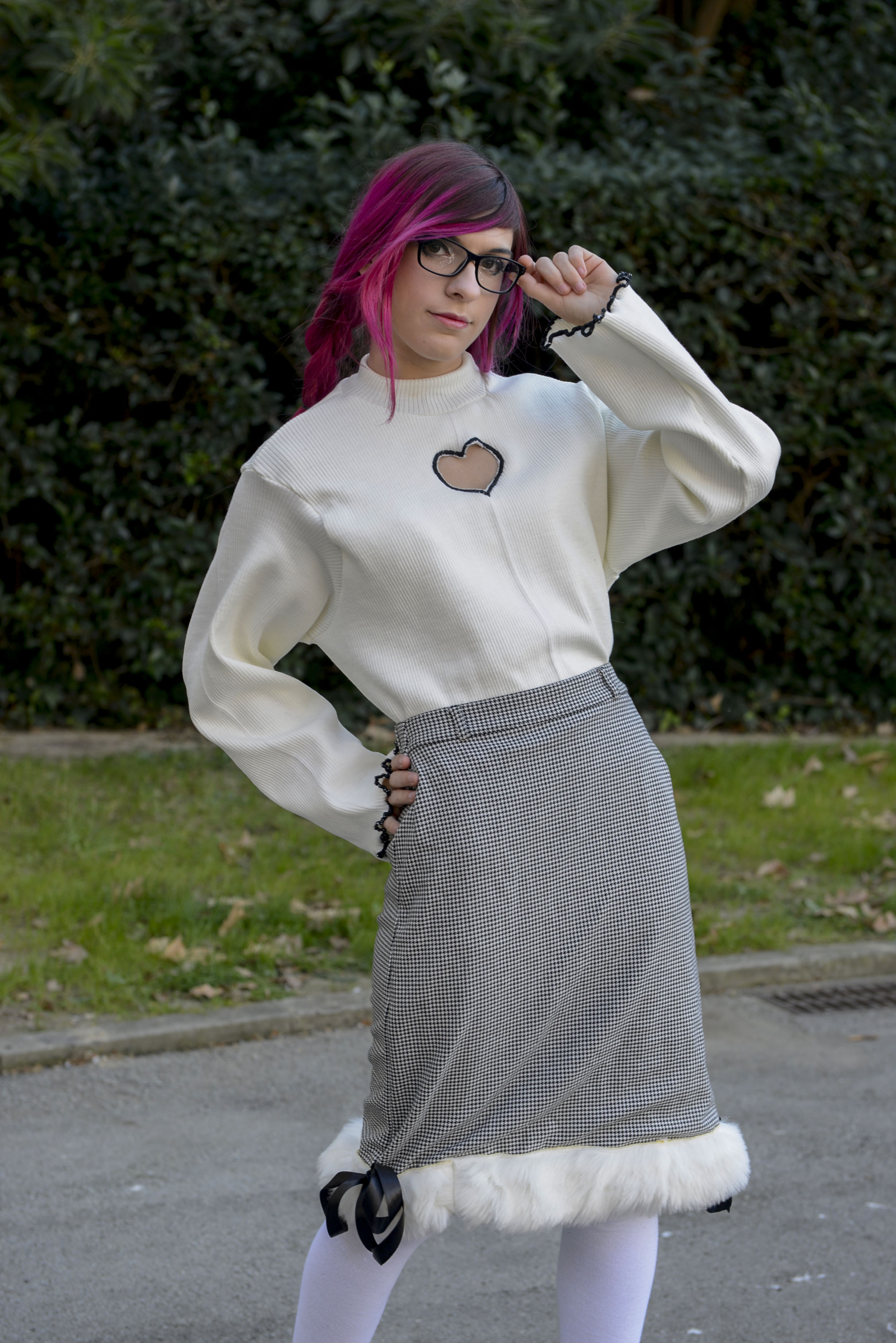 Classic hound's tooth lined skirt with fuzzy and soft fabric and ribbons, of course. What is Ribbolution without ribbons in what need them? : D